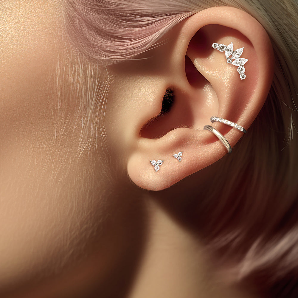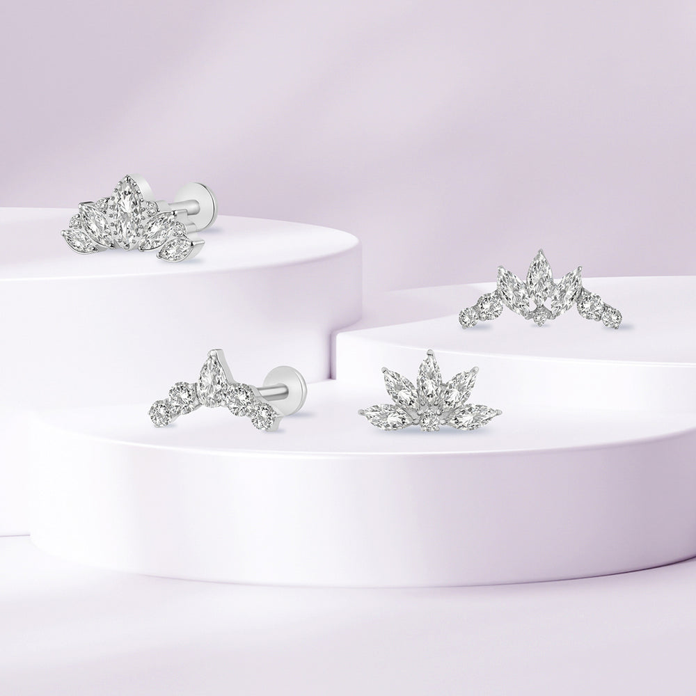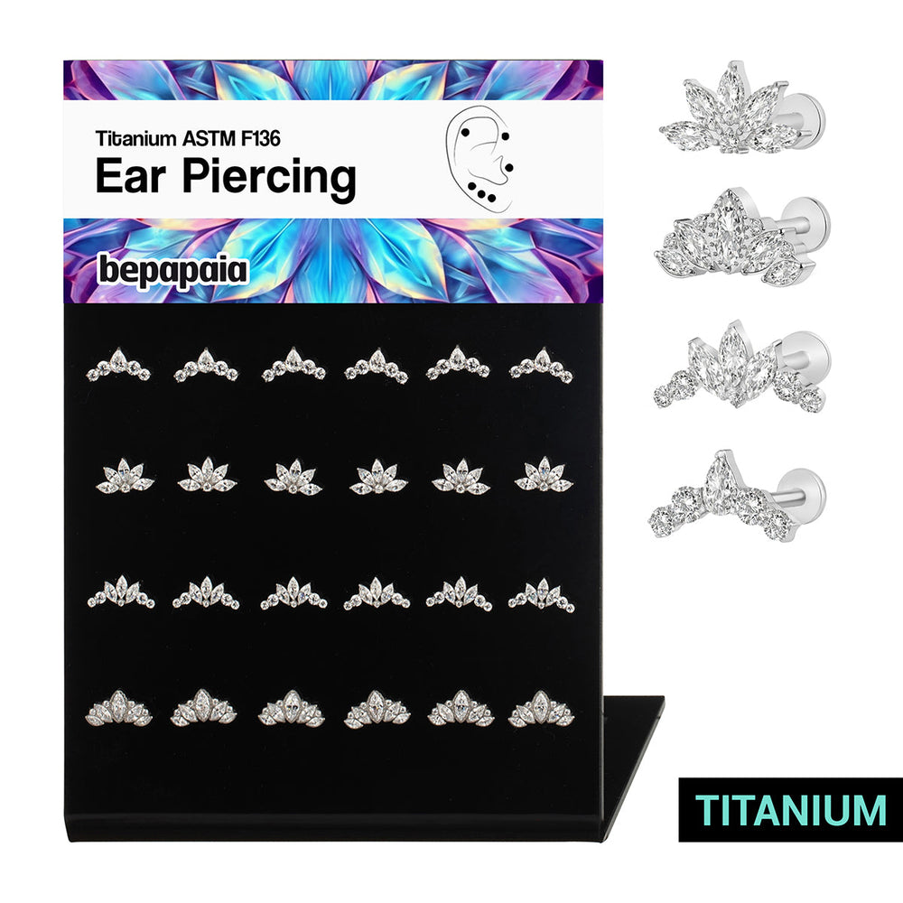Descripción: Piercing de oreja de Titanio G23 con brillantes. 4 diseños de tendencia disponibles. Un piercing sofisticado para las chicas más glamurosas. ¡Ofrece a tus clientes piercings de alta gama!