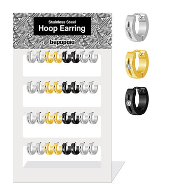 1.6mm thick steel hoop earring. The display combines 6, 8 and 10mm hoops in steel, gold and black. A unisex classic, very versatile and timeless.