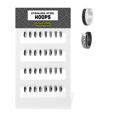 Stainless steel huggie hoop with black lines. A classic hoop earring with urban style available in assorted designs. This is a very recommended it...