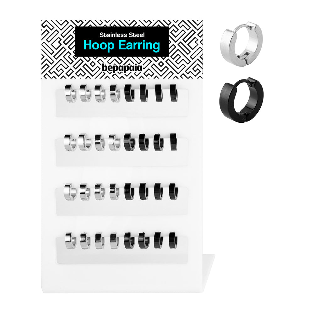 Stainless steel hoop earrings. Steel and black steel. This hoop earring, also called as "Huggies" comes in size: 4 x 9 mm. Classical model which we recommend to every shop. Sold both for men and women.