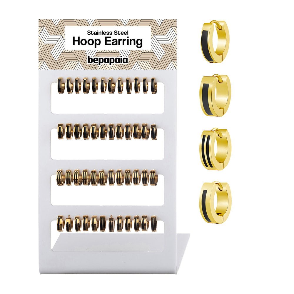 Gold Stainless Steel huggie hoop earring with black enamel. 4 assorted designs. Expand your collection of men's earrings!