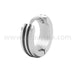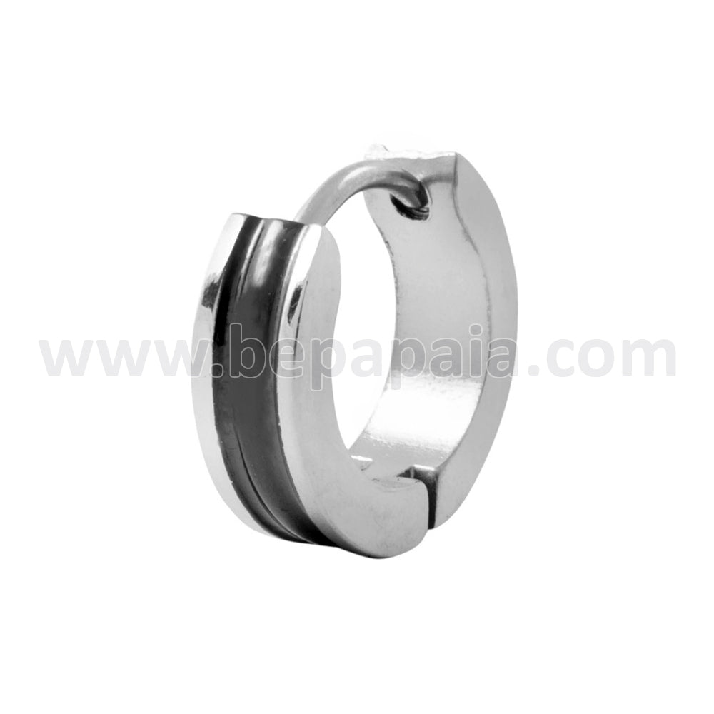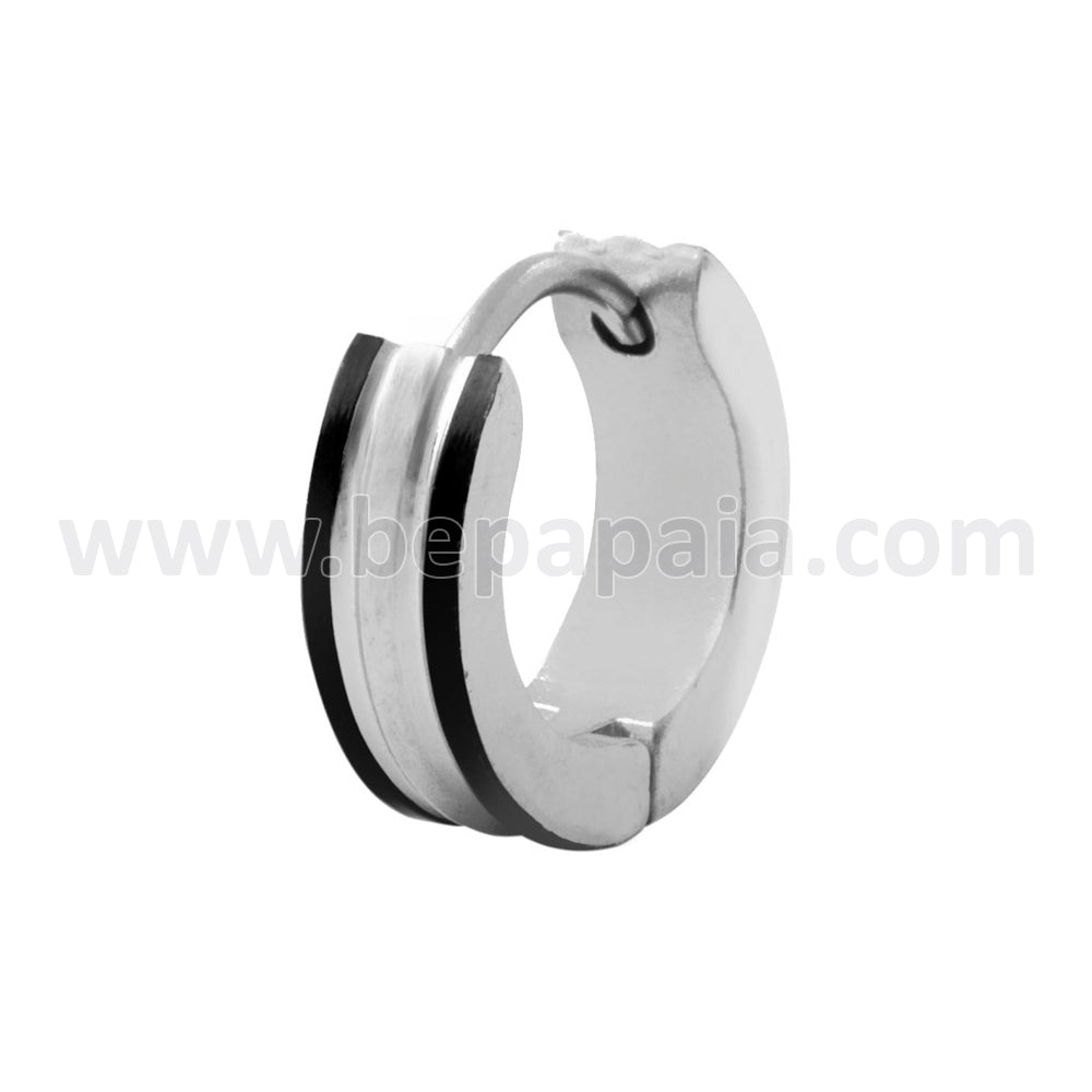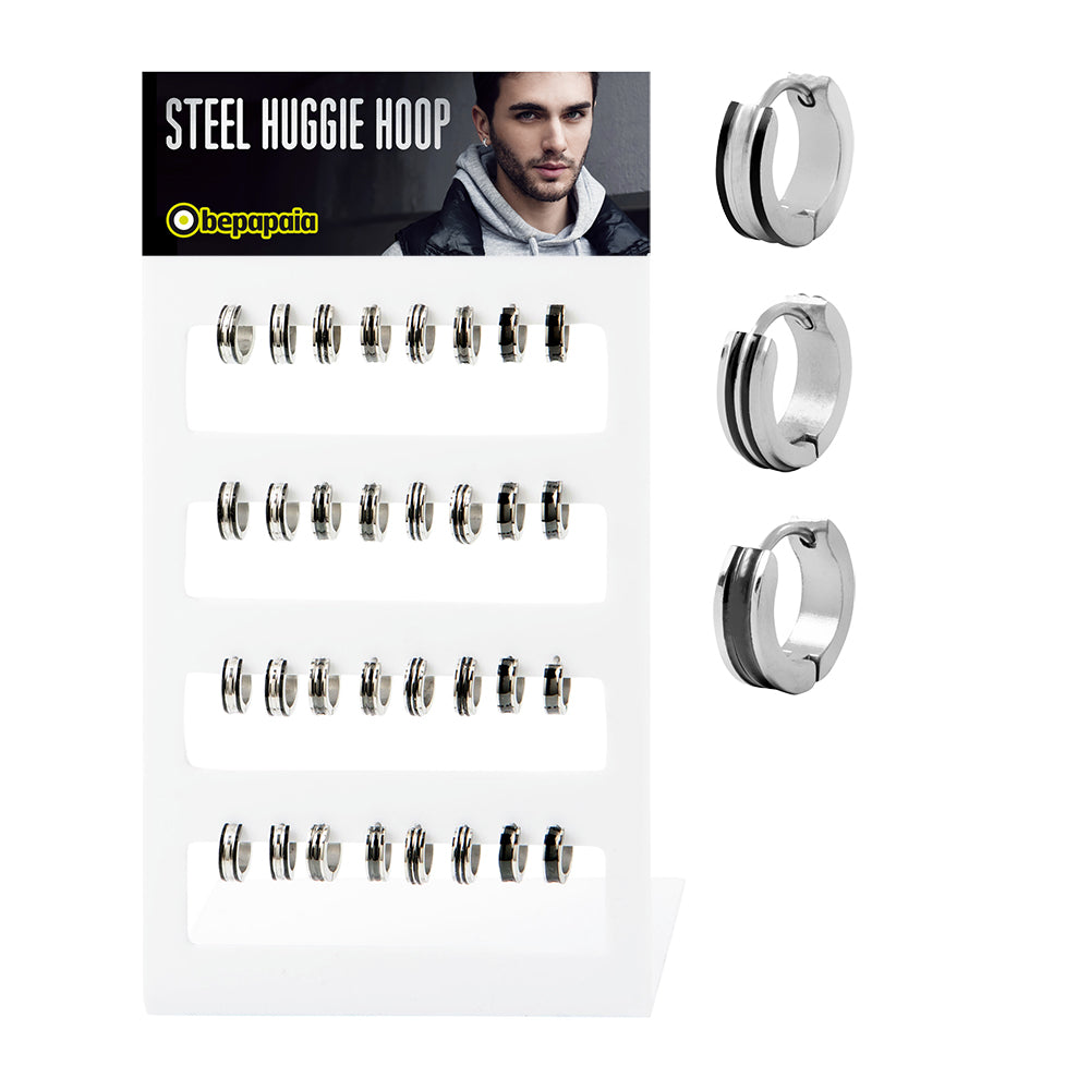 Stainless steel huggie hoop with black lines. A classic hoop earring with urban style available in assorted designs. This is a very recommended item for shops that sell jewelry for men. Best Seller!