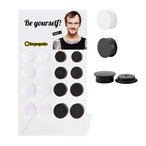 Acrylic ear plug black and white with a screw fit. Comes in a range of sizes: 14, 16, 18 y 20 mm. This is a basic item, which is perfect for those who want to "hide" their hole (for example in a work place). Good seller!