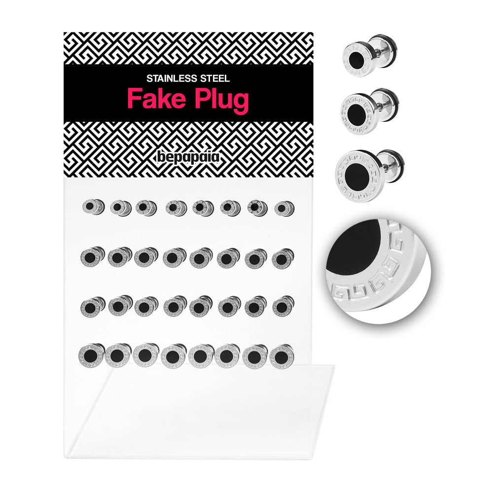 Stainless steel fake plug with tribal design. Assorted sizes: 6-10 mm. One of our best seller!