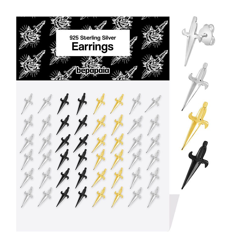 Silver earring, gold and black bath with a sword shape Silver earring, gold and black bath with a sword shape