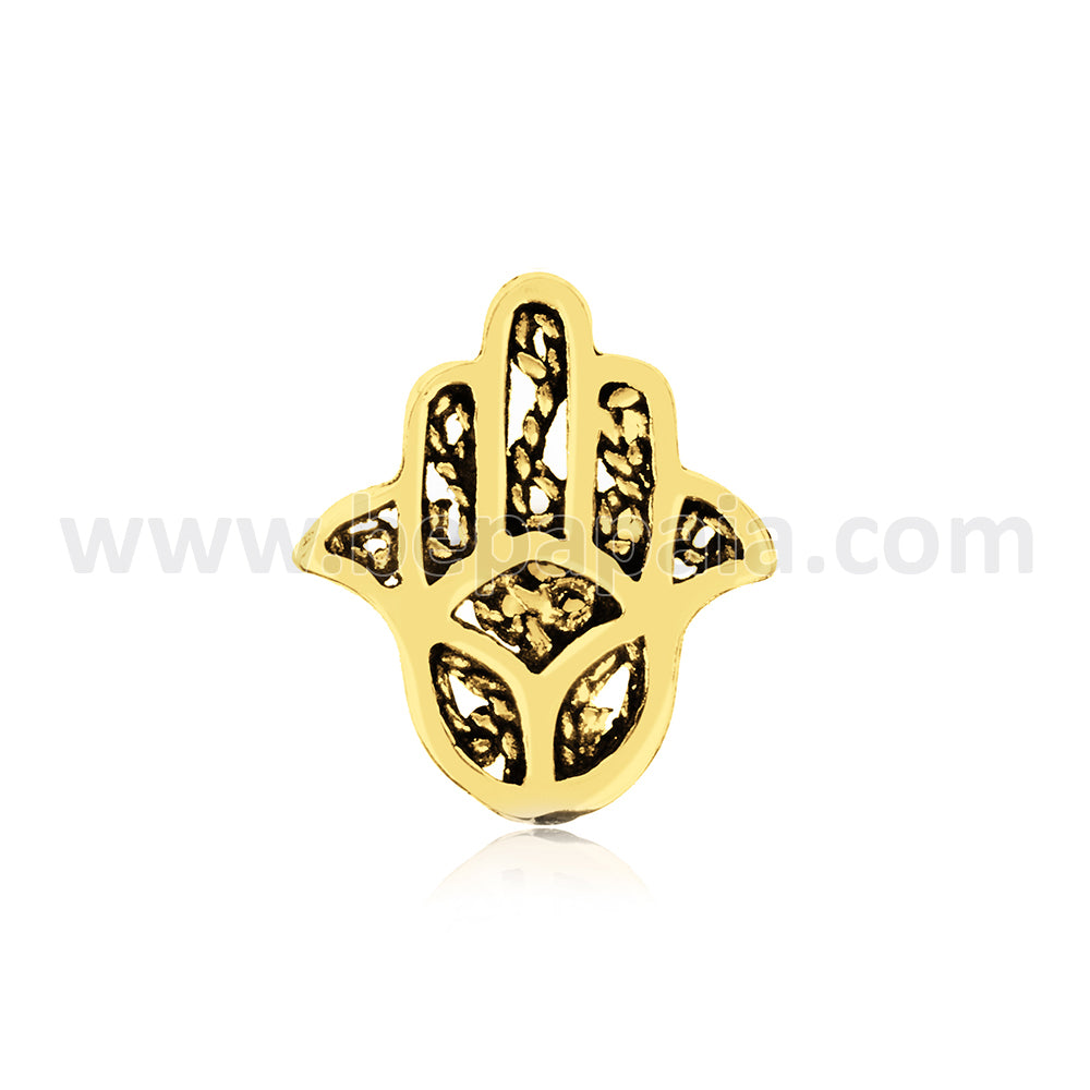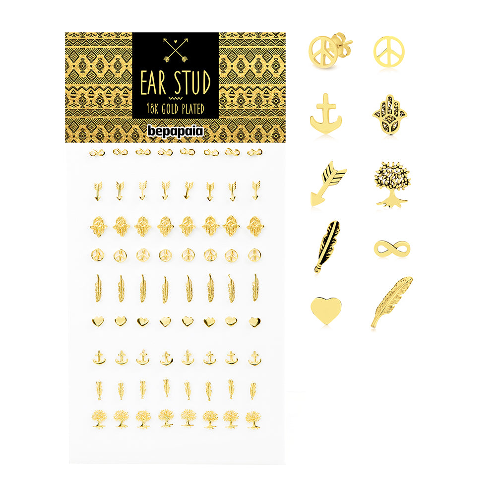 Description: 18k gold-plated sterling silver ear stud with varied designs. A wide selection of gold-plated silver ear studs in one display: The infinity symbol, arrows, the hand of Fatima, the peace symbol, a feather, a heart, an anchor and the tree of life. A great assortment display with the most current and bohemian symbols, perfect for all types of shops and styles.
