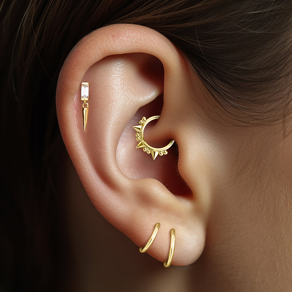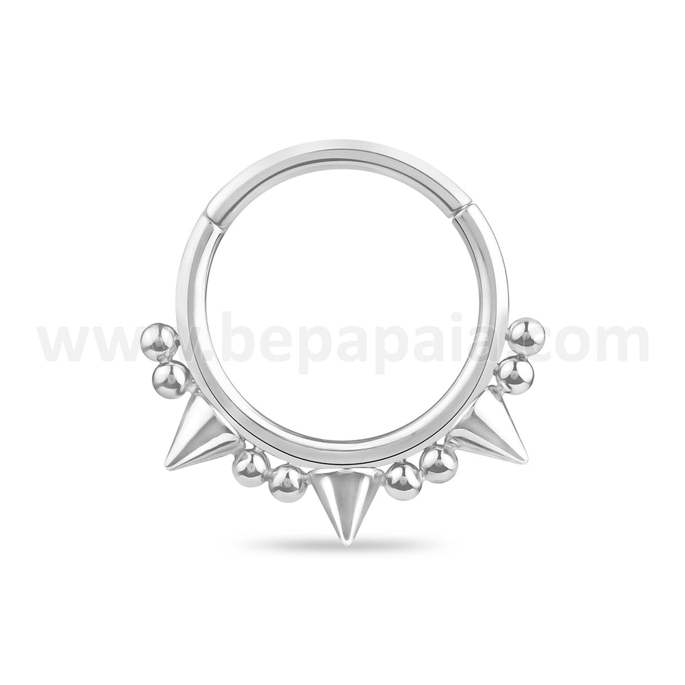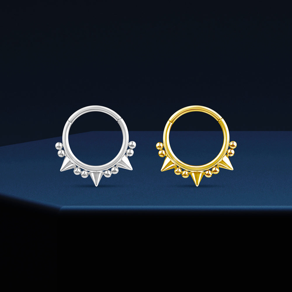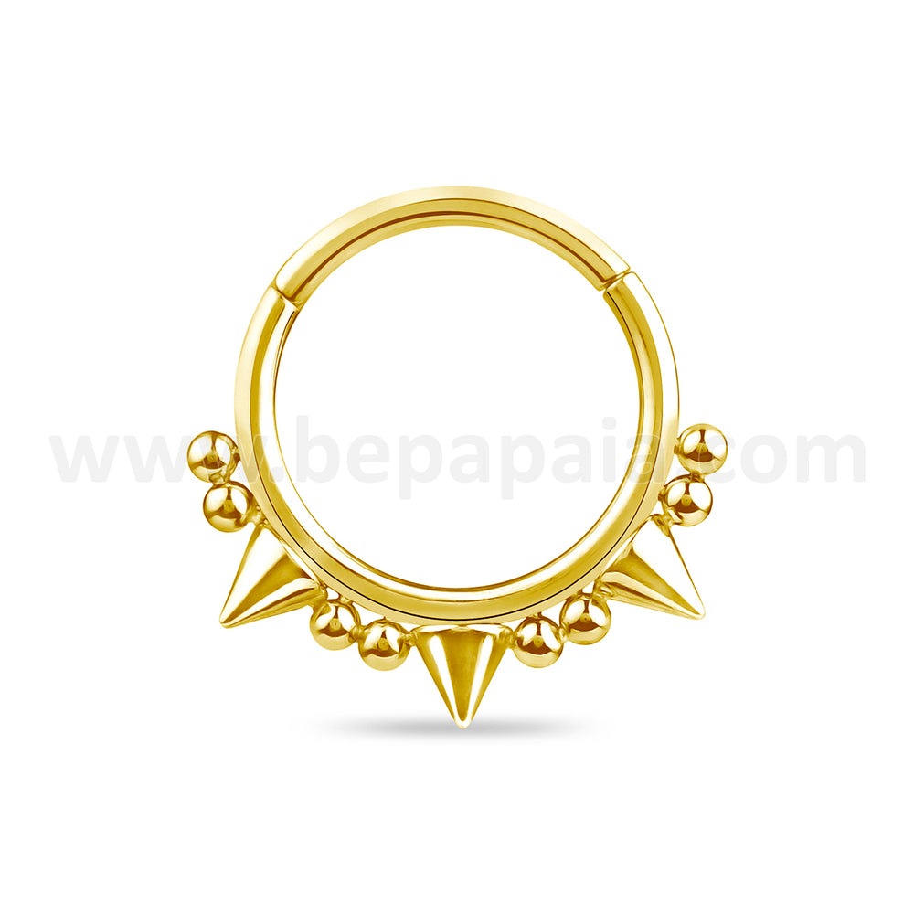 316L Surgical Steel segment ring with cone and little balls. Available in 2 colors: steel and gold steel. Buy now this punk and refined piercing!