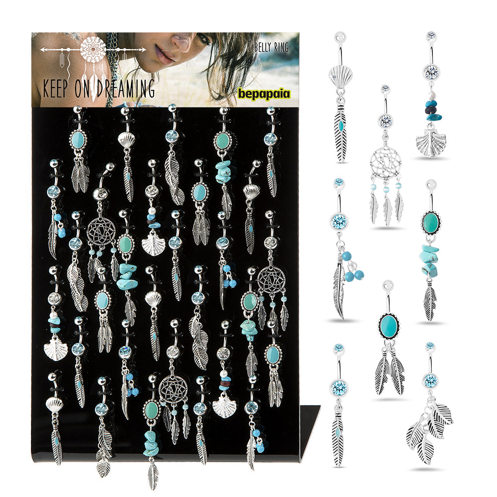Bepapaia brings to you a display only suitable for dreamers, with lots of designs that combine the same motifs in different ways: turquoise stones, feathers, shells, dreamcatchers and jewels. Size: 1.6 x 10 mm. Fresh and summery models, ideal for wearing on the beach or at a music festival, and all with the assurance of our surgical steel. Don't miss out!