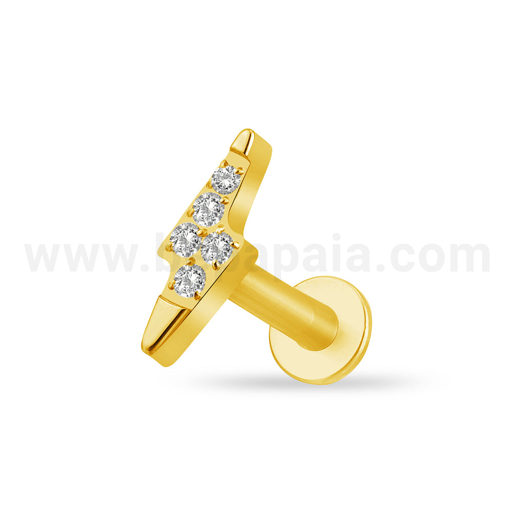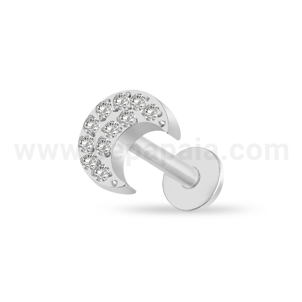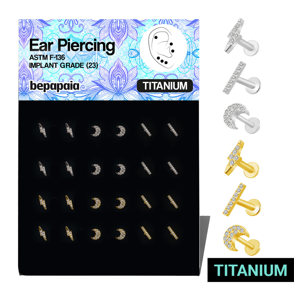 Description: Titanium glam ear piercing with gems (ASTM F-136 G23). 3 cool designs: moon, bar and lightning with gems. Available in Titanium and gold colour Titanium. For your most demanding clients! They will fall in love.