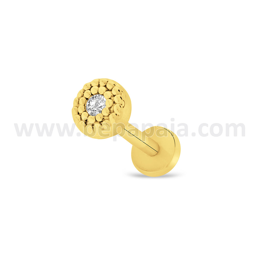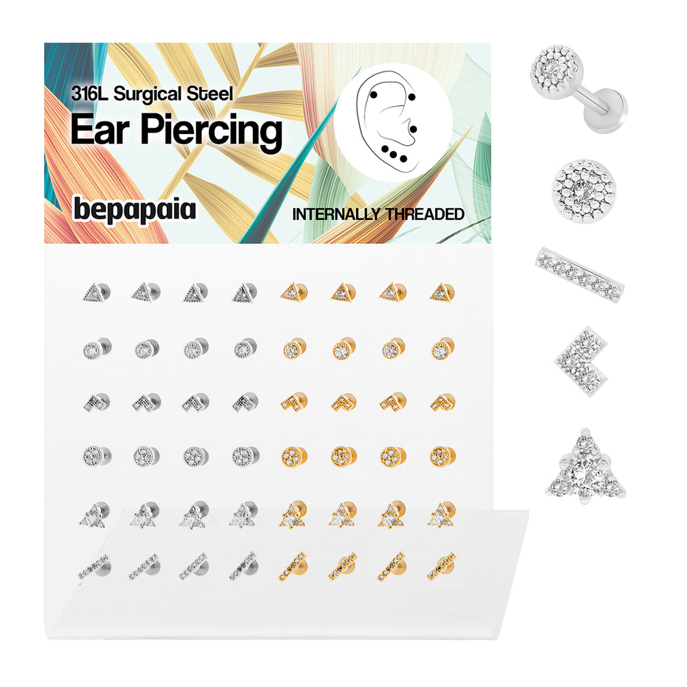 Surgical steel 316L tragus piercing with geometric shapes and gems. 6 shapes available in steel and gold color.