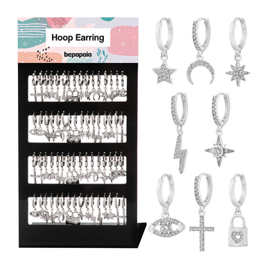 Boucle d’oreille Créole en acier avec pendentifs variés. 8 modèles tendances, tous disponibles avec anneau lisse et pierres. Ce présentoir va parti...