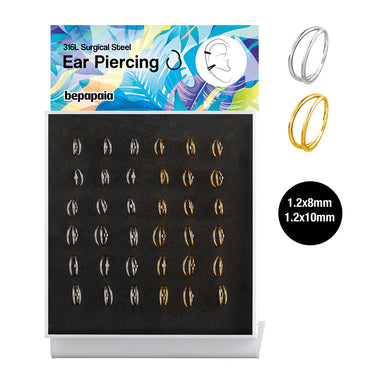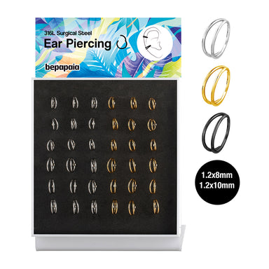 Piercing anneau à charnière avec fermeture Clicker en Acier Chirurgical 316L. 5 designs disponibles. Proposez à vos clients ce présentoir de pierci...