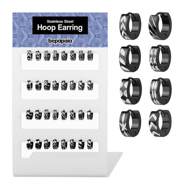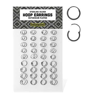 Orecchini a cerchio huggie in acciaio nero lucidato di varie dimensioni. Un espositore essenziale se stai cercando orecchini per ragazzi.