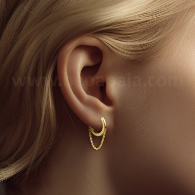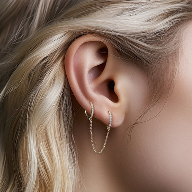 Doppio orecchino in argento con placcatura in Oro 18K con brillante e catena. Disponibile con taglio brillante rotondo e baguette.