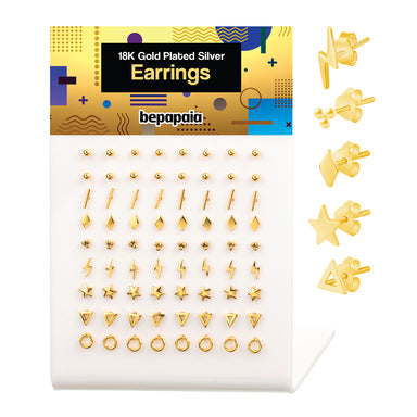 Orecchino a bottone in argento con placcatura in Oro 18K con zirconi assortiti. 6 modelli alla moda disponibili. I tuoi clienti adoreranno questo d...