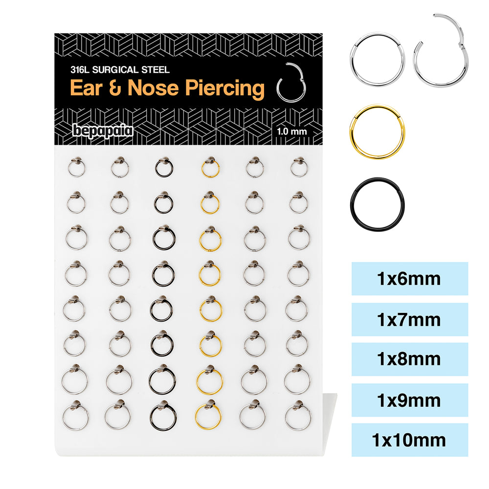 Piercing cerchio cerniera in acciaio chirurgico 316L da 1,0 mm di spessore. Ideale sia per l'orecchio che per il naso. Disponibile nei diametri 6, 8 e 10 mm e in tre colori: acciaio, oro e nero. Un basic che non passa di moda, con una varietà di misure e colori.