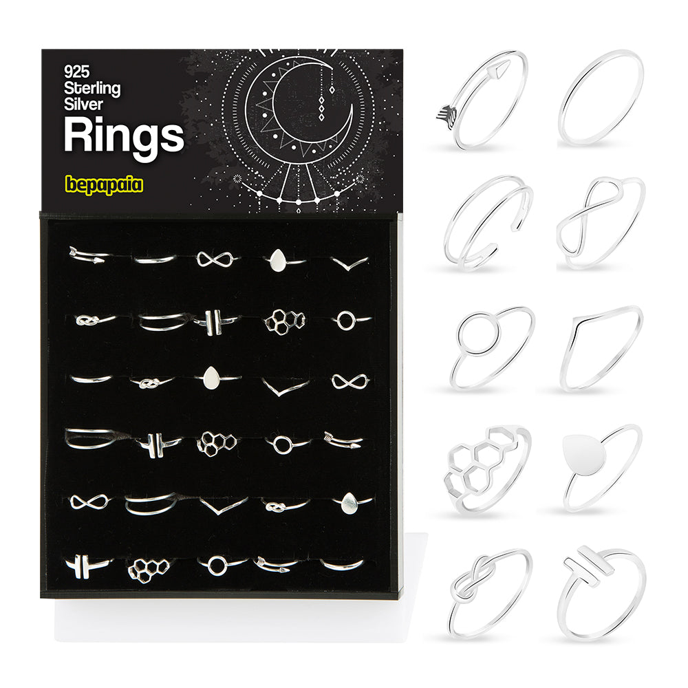 Descripción: Anillo de plata de ley liso. Este expositor contiene una combinación de anillos de medidas 6, 7 y 8.