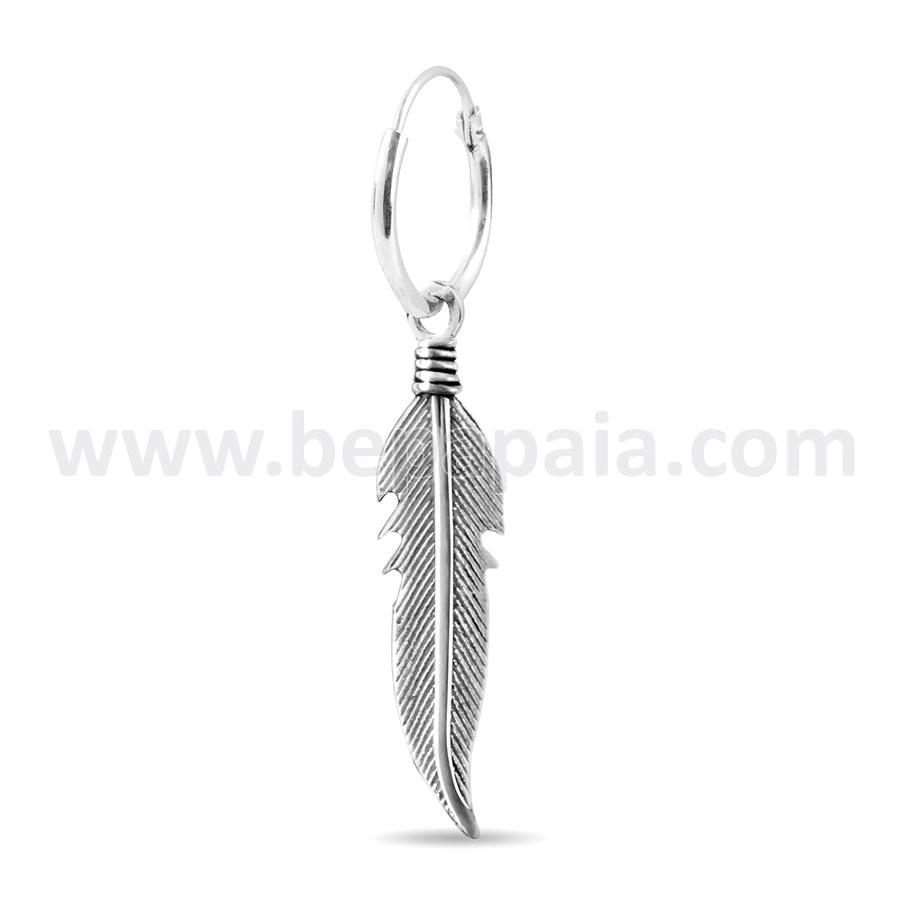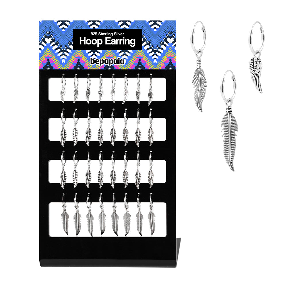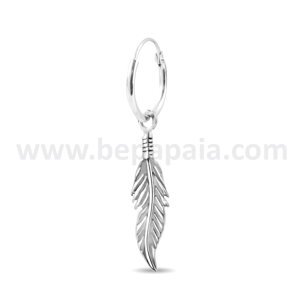 Descripción: Aro de Plata de Ley 925 con pluma colgante. Tres diseños de pluma disponibles en este expositor super ventas. Los pendientes boho se venden muy bien. Este es uno de nuestros best sellers.