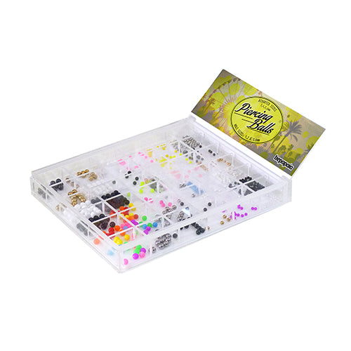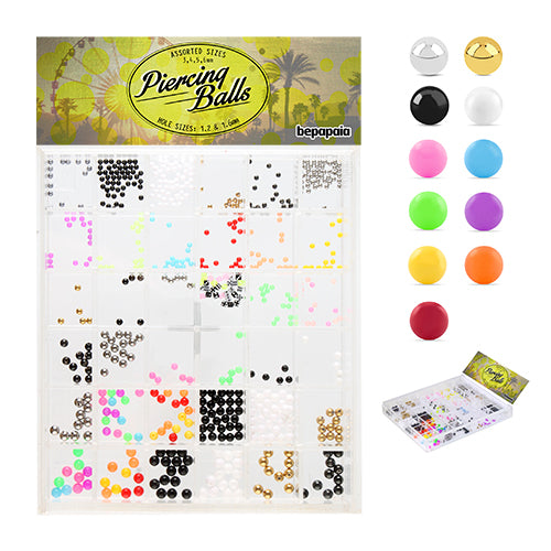 Descripción: Bolas lisas sueltas variadas de colores y tamaños. Esta caja contiene bolas para piercing de 1.2 y 1.6 mm de grosor, de acrílico y acero. Disponible en 3-6 mm de diámetro. Una caja recomendada para las tiendas que quieren empezar a vender bolas sueltas.
