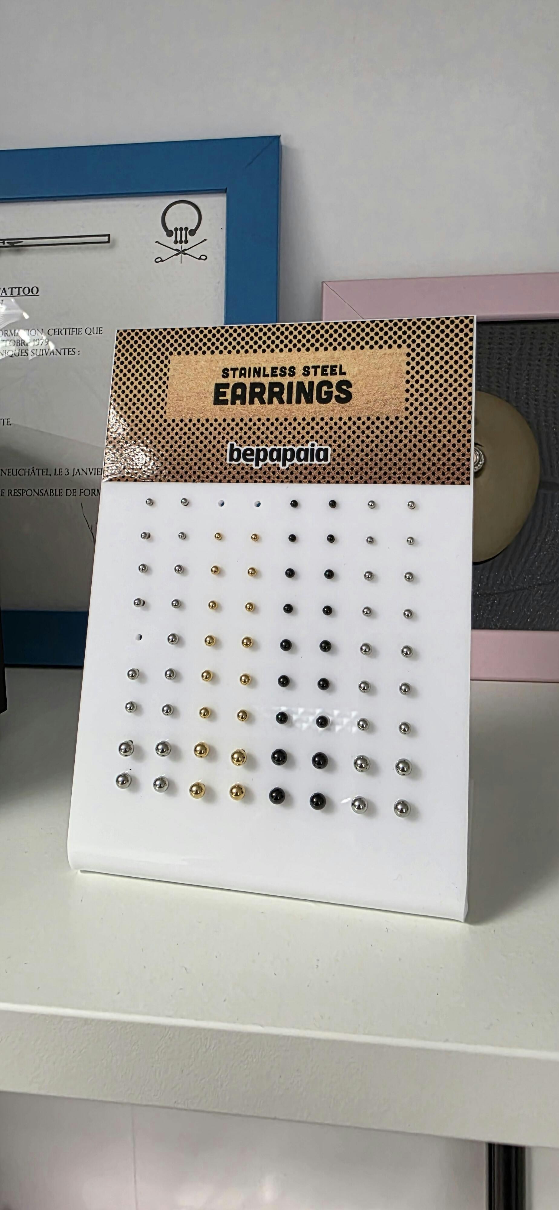Pendiente de acero con bola en 3 colores: acero, dorado, rosado y negro. Disponible en varias medidas de 2 a 4mm. Muy fácil de combinar, un clásico atemporal para todos los gustos.