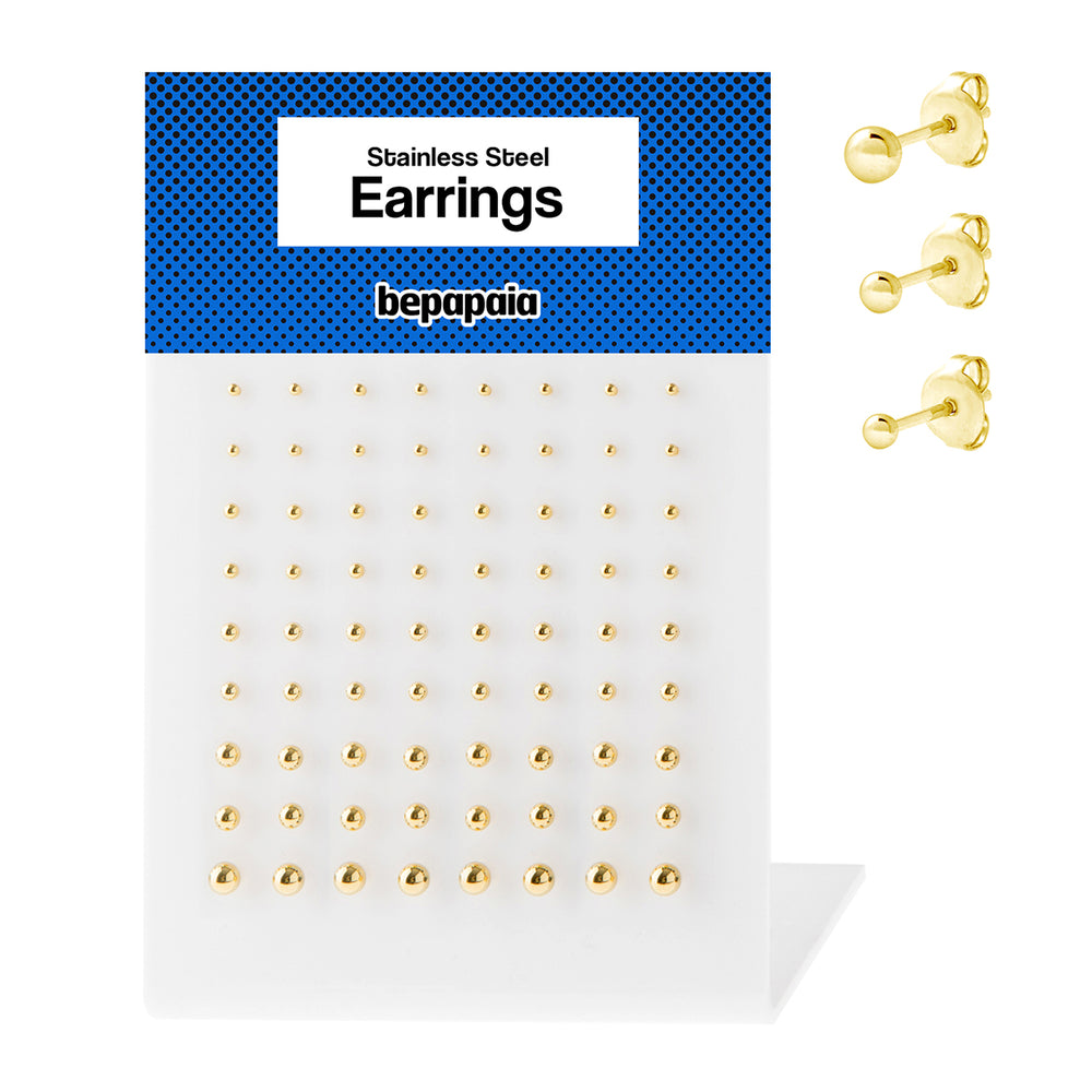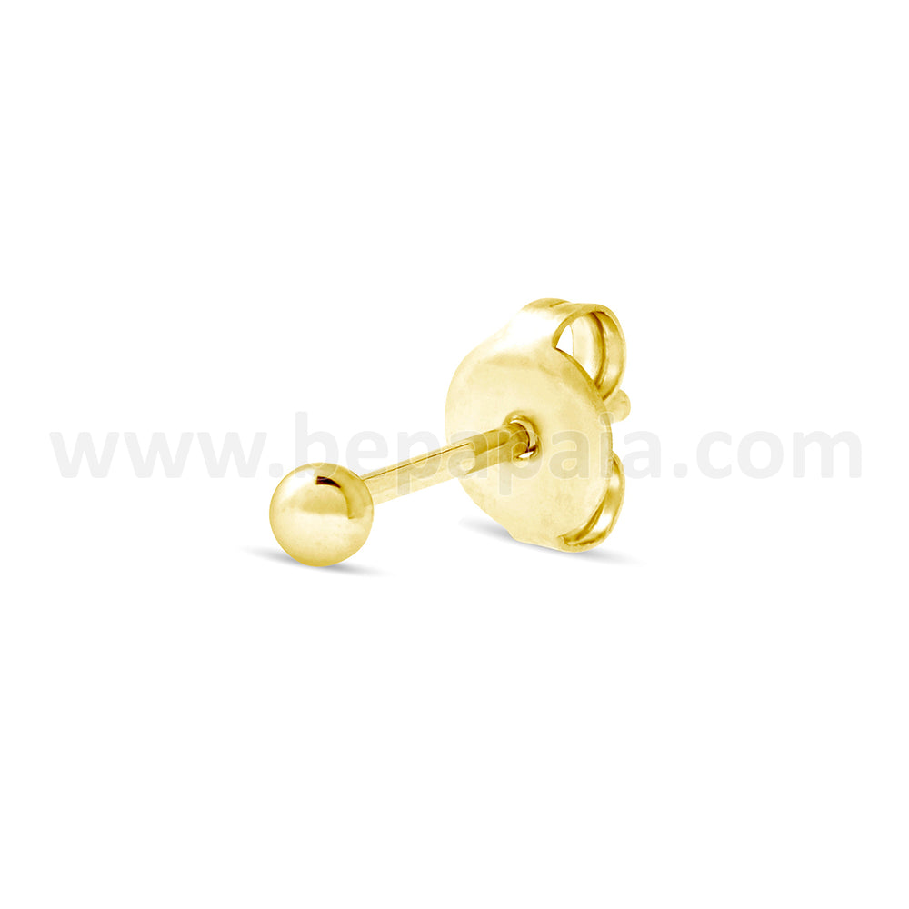 Pendiente de acero dorado con bola. Disponible en varios diámetros de bola, de 2 a 4mm. Un pendiente básico, versátil y atemporal, para todos los públicos. Al ser de acero, su color no desaparece con el paso del tiempo, ni se deteriora con el agua.