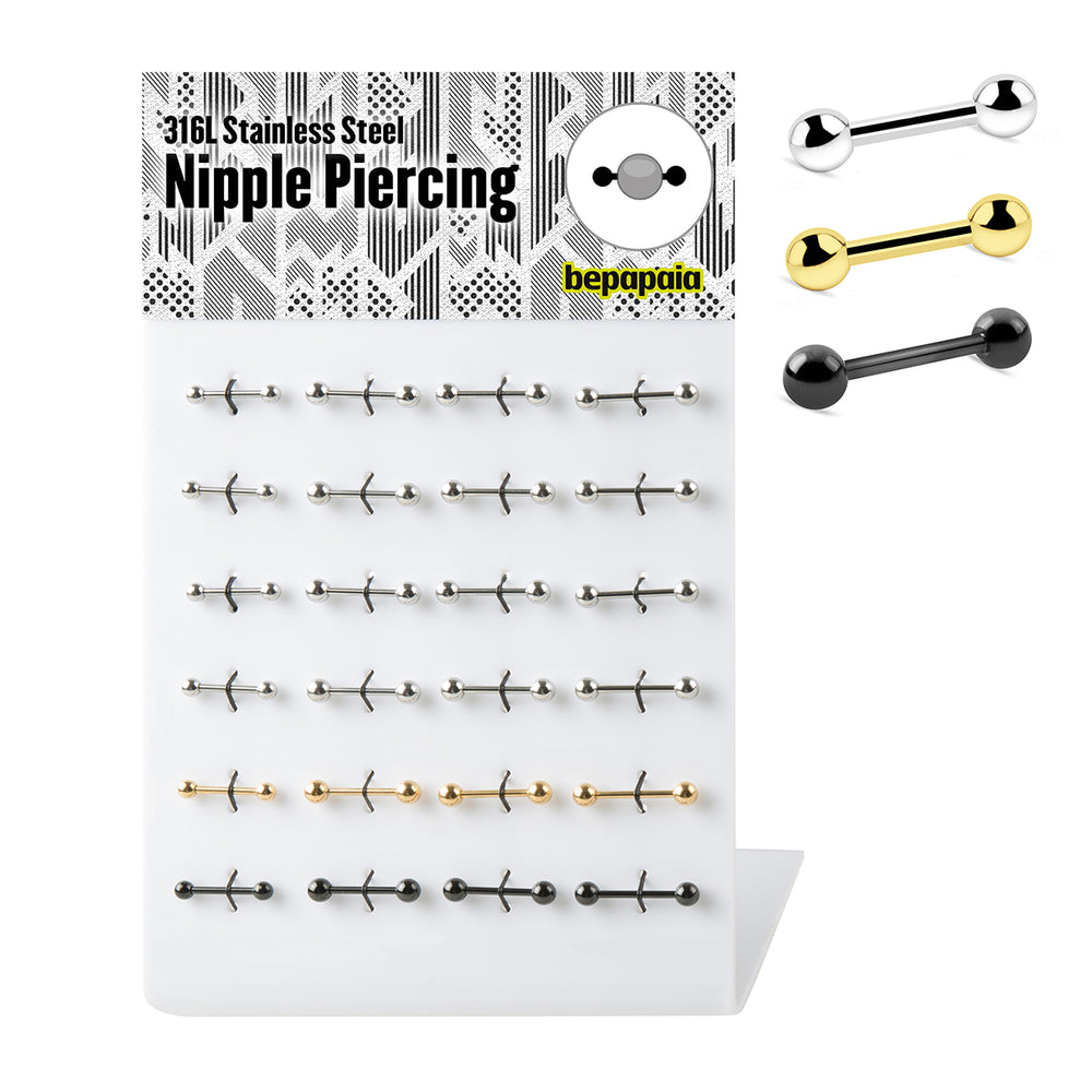 Piercing de pezón de Acero Quirúrgico 316L. Este modelo liso en varios colores es un bestseller básico. Medidas: 1.6 x12-16mm.